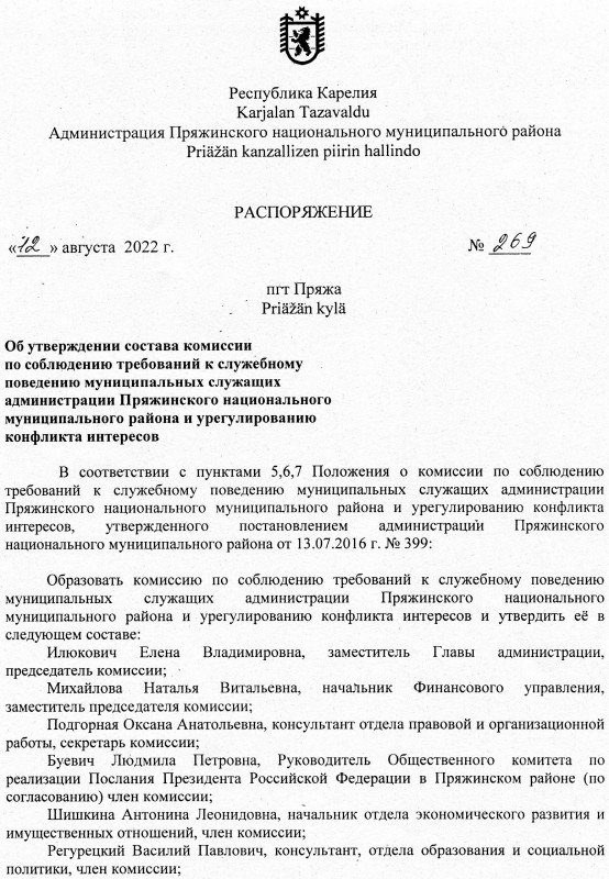Комиссия по соблюдению требований к служебному поведению муниципальных служащих администрации Пряжинского национального муниципального района и урегулированию конфликта интересов