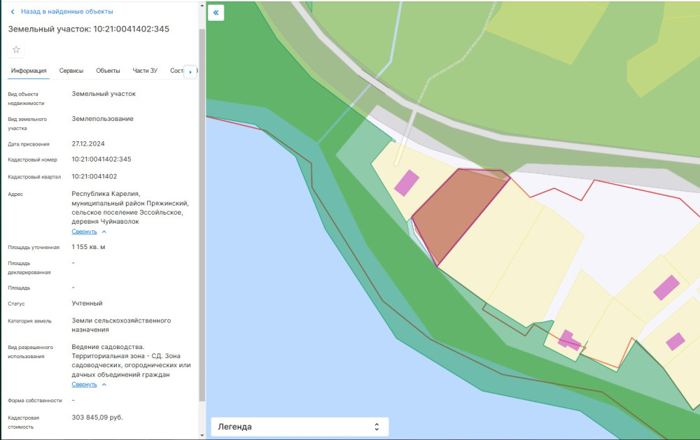 Лот №1.Право заключения договора аренды земельного участка из земель сельскохозяйственного назначения, имеющего кадастровый номер 10:21:0041402:345, площадью 1155 кв. м, местоположение: Республика Карелия, муниципальный район Пряжинский, сельское поселение Эссойльское, деревня Чуйнаволок, вид разрешенного использования - Ведение садоводства.