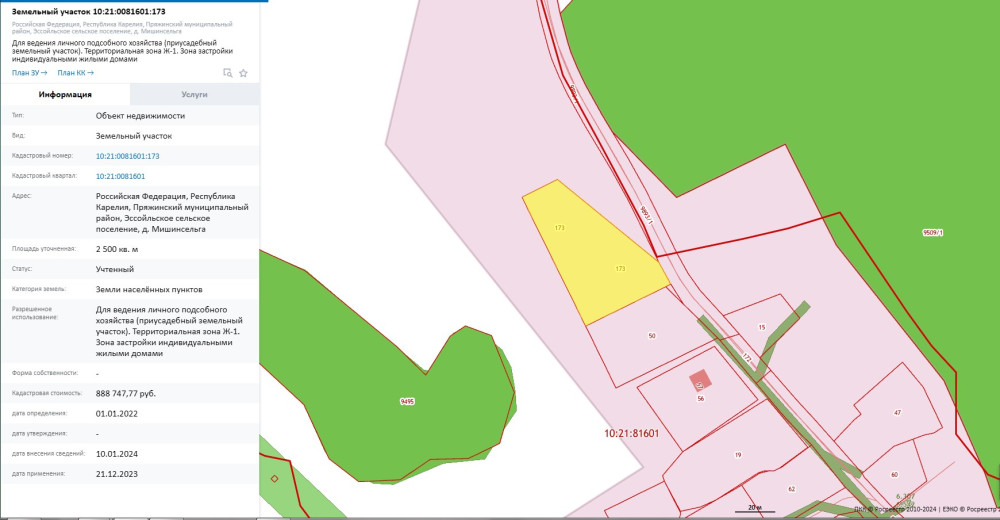 Лот №4. Продажа земельного участка из земель населенных пунктов, имеющего кадастровый номер 10:21:0081601:173, площадью 2500 кв. м, местоположение: Российская Федерация, Республика Карелия, Пряжинский муниципальный район, Эссойльское сельское поселение, д. Мишинсельга, вид разрешенного использования – «Для ведения личного подсобного хозяйства (приусадебный земельный участок). Территориальная зона Ж-1. Зона застройки индивидуальными жилыми домами».