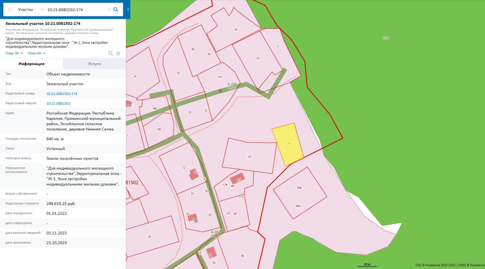 Лот №2.Право заключения договора аренды земельного участка из земель населенных пунктов, имеющего кадастровый номер 10:21:0081502:174, площадью 840 кв. м, местоположение: Российская Федерация, Республика Карелия, Пряжинский муниципальный район, Эссойльское сельское поселение, деревня Нижняя Салма, вид разрешенного использования – «Для индивидуального жилищного строительства». Территориальная зона – «Ж-1. Зона застройки индивидуальными жилыми домами».